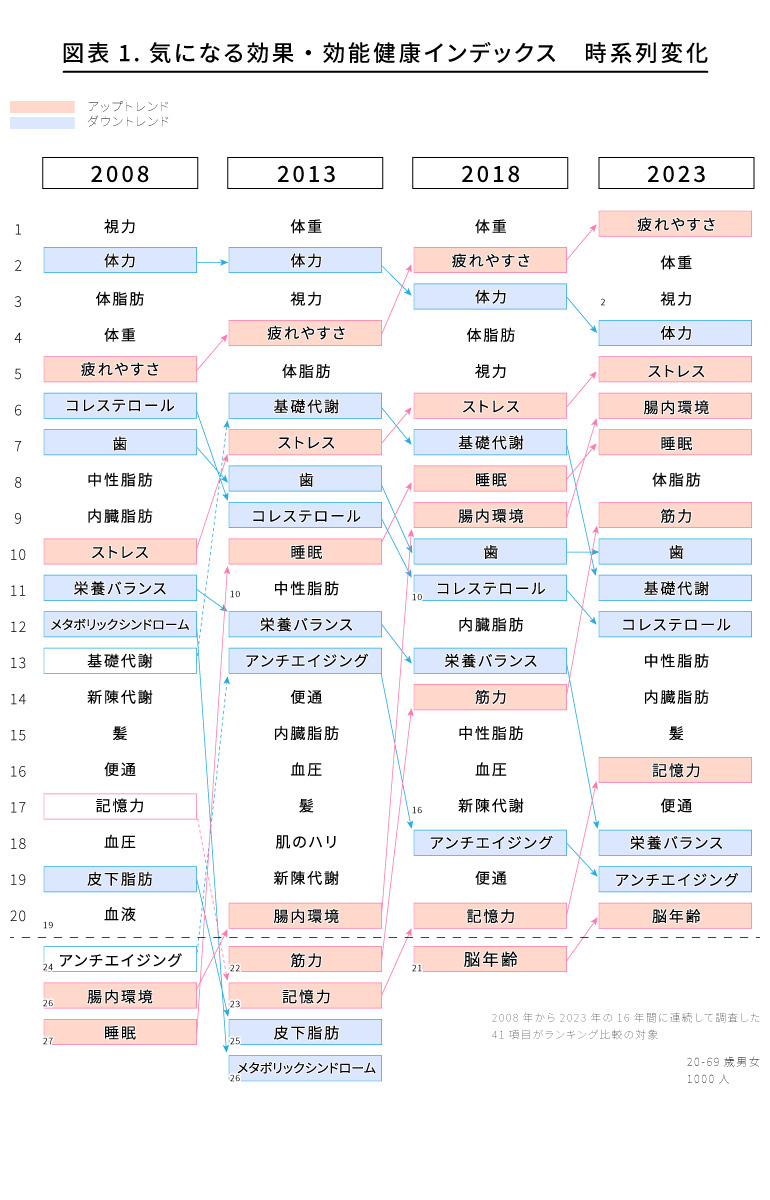 時系列で見ると2023年の1位は「疲れやすさ」、2位は「体重」、3位は「視力」、次いで「体力」、「ストレス」が上位5位でした。「疲れやすさ」と「ストレス」は2008年からランクを上げており、「疲れやすさ」は2008年に5位でしたが着実にアップしています。2023年に上位20位内に入ったもので、2018年より順位を上げていたのは「疲れやすさ」、「ストレス」、「腸内環境」、「睡眠」、「筋力」、「脳年齢」でした。