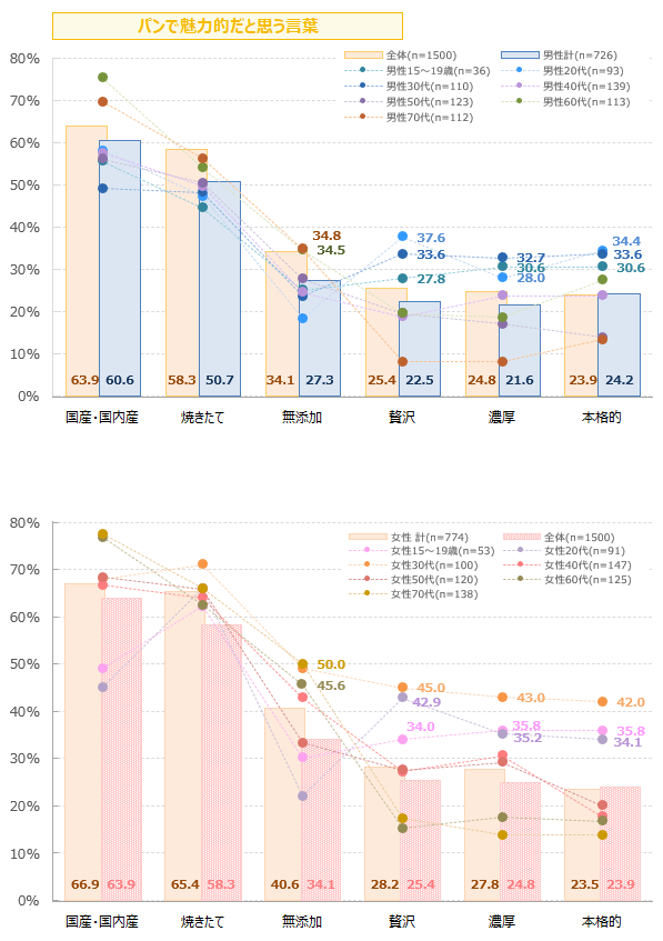 パンを買う際に魅力的だと思う言葉は、「国産・国内産」が最も高く6割強、次いで「焼きたて」が6割弱。その他性年代別の傾向がわかれているものは、「贅沢」「濃厚」「本格的」は男女ともに10-30代が高い傾向で、「無添加」は男女ともに60-70代に高い傾向。