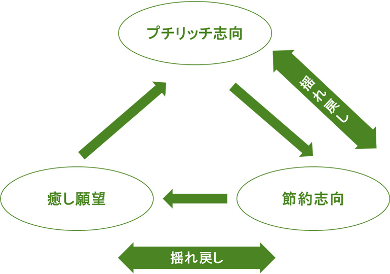 先行き不安を抱えながら、節約が常態化している日々の中で、生活者の心には、ときに「癒し願望」が生まれます。頑張っている自分にたまのご褒美。「たまハレ消費」「自分ご褒美消費」として、いつもよりちょっといいもの、おいしいものを求める「プチリッチ志向」が生まれます。そして「プチリッチ消費」の後、しばし癒された生活者は、再び「節約志向」に舵を切るという図式です。「節約志向」と「プチリッチ志向」は「揺れ戻し」の関係にあると言え、さらに「節約志向」と「癒し願望」も「揺れ戻し」関係にあります。このトライアングル関係は、安全な食を求める「安全安心志向」や健康な心身を求める「ヘルシー志向」と同様、今後も毎年登場する不変のトレンドになると思います。特に、現在のように、政治や経済がイケイケなのに、生活者が取り残されている。このように、ふたつのベクトルが逆を向いているとき、トライアングル関係が顕在化すると考えています。